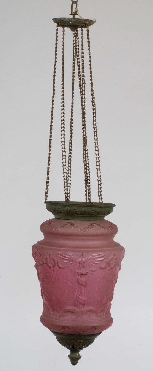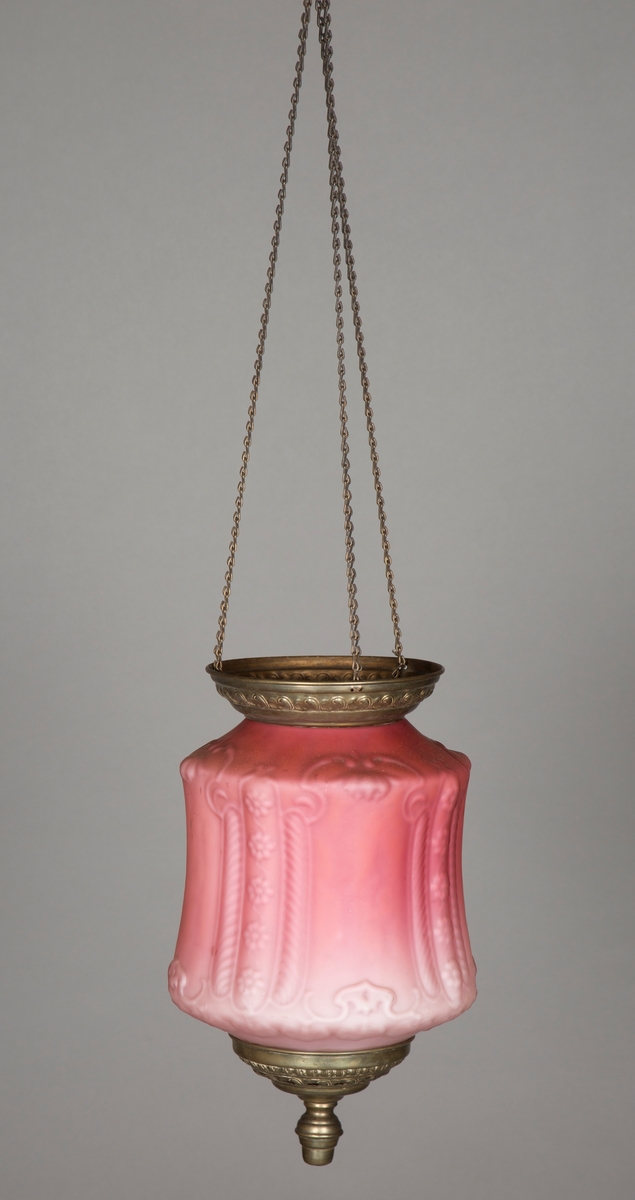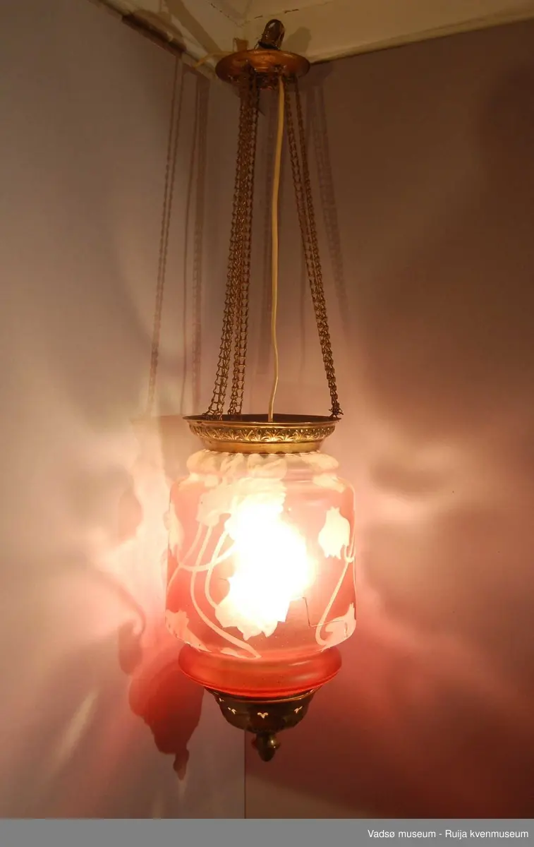 Måneskinnslampe / Lampe - Norsk Folkemuseum / DigitaltMuseum : Sylinderformet måneskinnslampe i rosa glass med blomsterdekor i.
